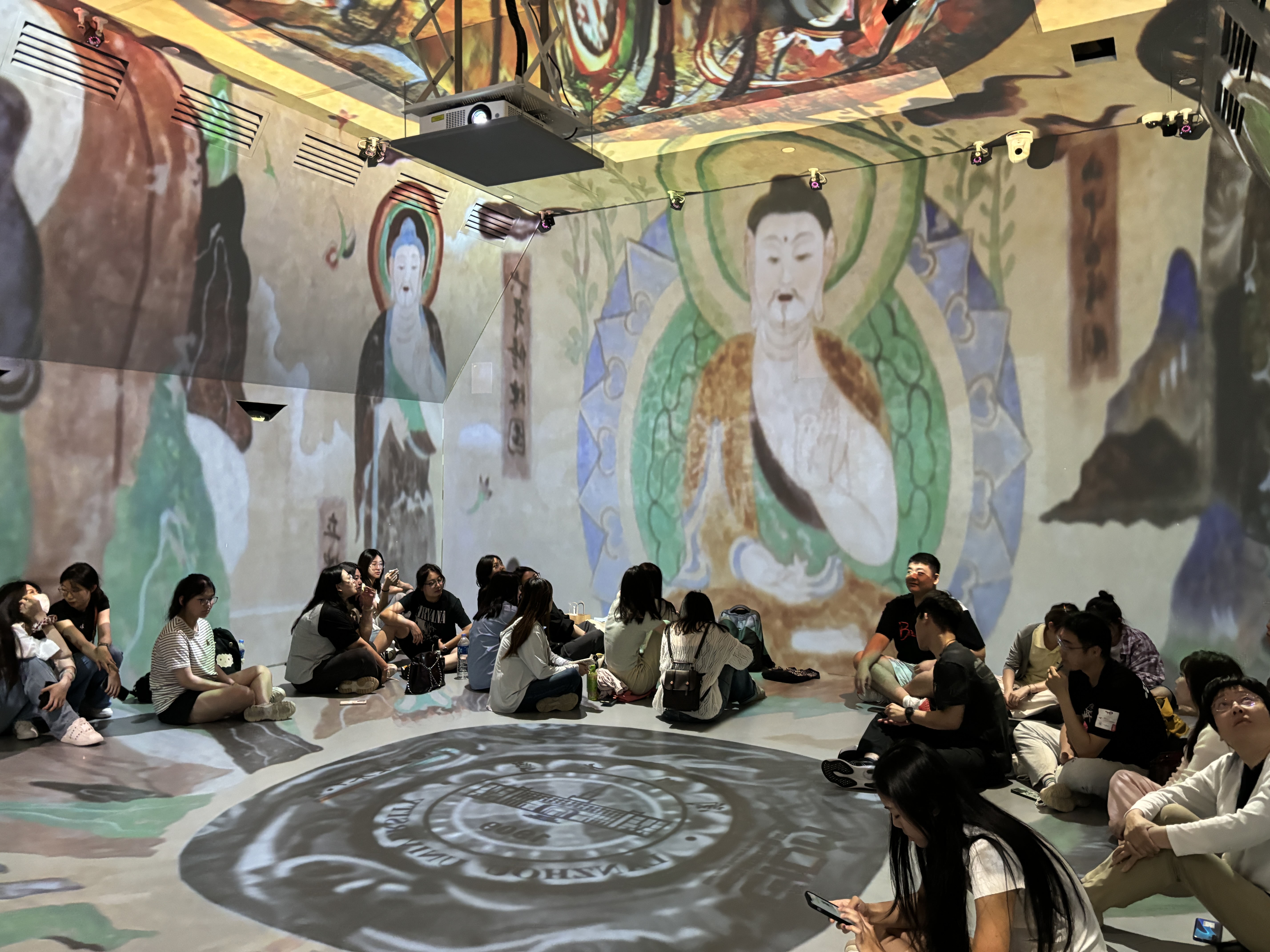 The visit began with an introduction to the CAVE, where delegates observed a virtual environment presentation on surrounding screens. Images captured students attentively watching an expert explain the technology, showcasing the immersive nature of the experience.